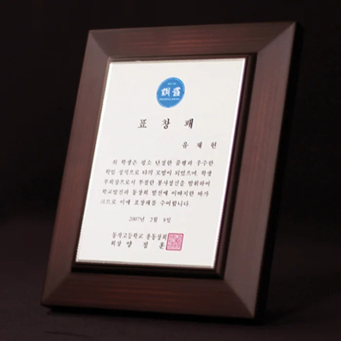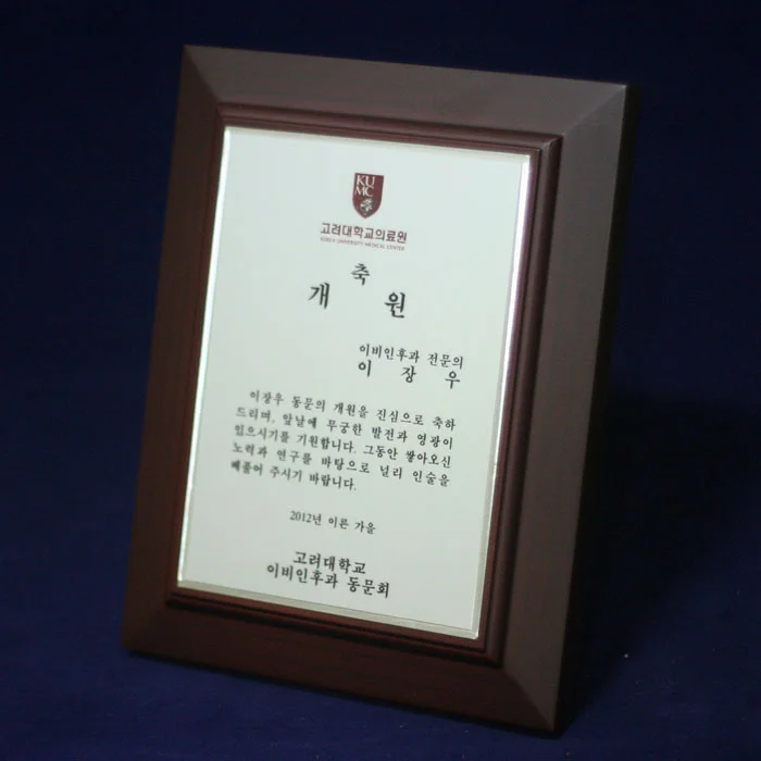 - 금속재질 에칭판에 사진 및 문안을 출력하여 나무 재질틀에 접목시킨 사진상패