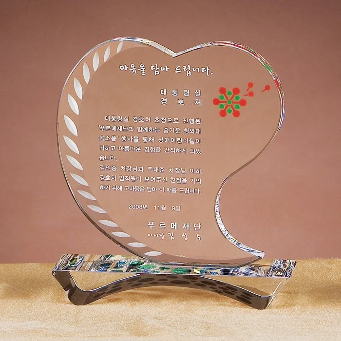 제조사좋은일엔상패트로피사이즈19*20.5*5cm재질크리스탈(pbo 24% 이하) 및 옵티칼글라스배송비무료배송배송방법택배 / 퀵 서비스 / 방문 수령 가능시안제작 시간2시간~15시간제품제작 시간2시간~15시간문안제작 방법샌딩(음각) 후 페인팅