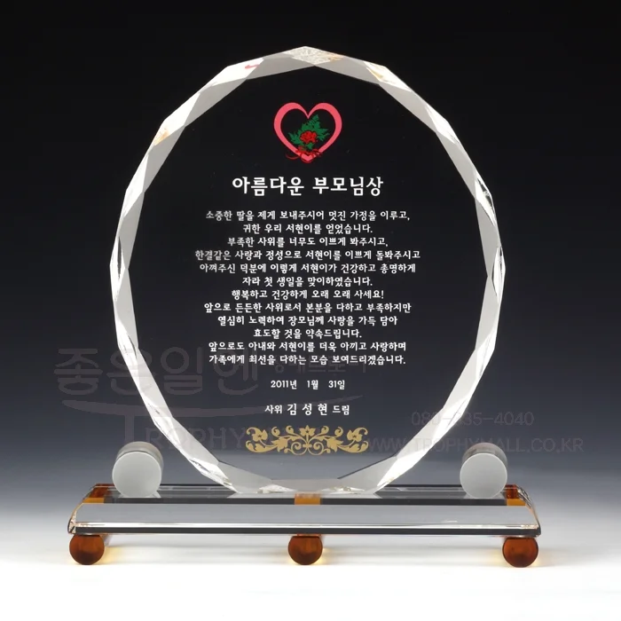 제조사좋은일엔상패트로피사이즈19*20*5cm재질크리스탈컷팅 및 크리스탈에 음각 후 페인팅배송비무료배송배송방법택배 / 퀵 서비스 / 방문 수령 가능시안제작 시간2시간~15시간제품제작 시간2시간~15시간문안제작 방법샌딩(음각) 후 페인팅