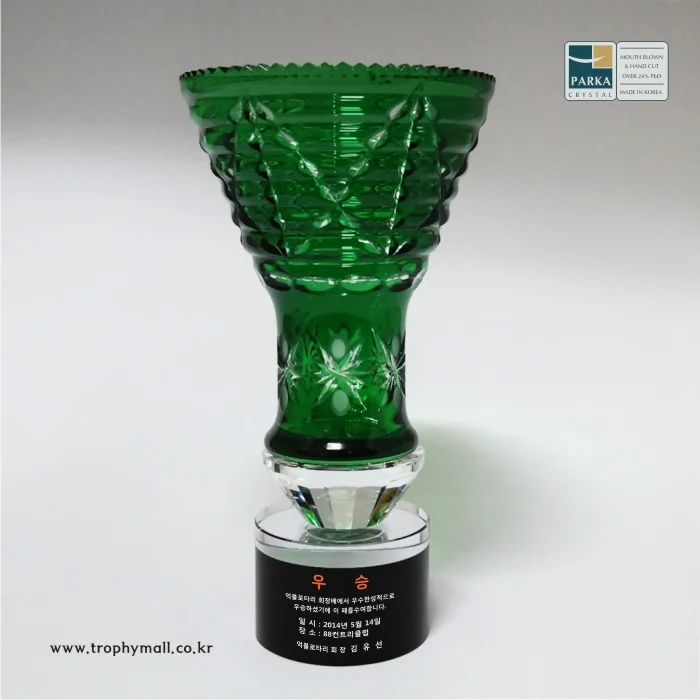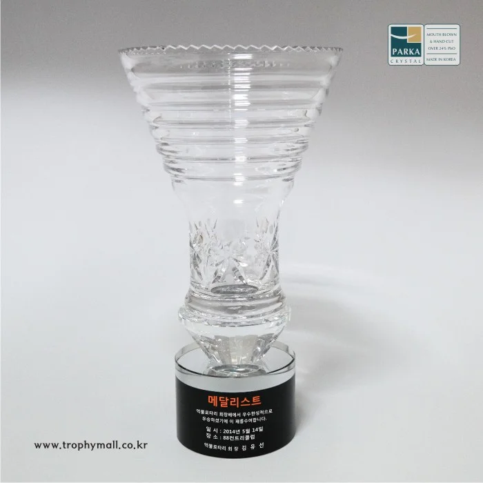 - 크리스탈 수공예 조각 컵과 블랙크리스탈 받침으로 이루어진 트로피 입니다.