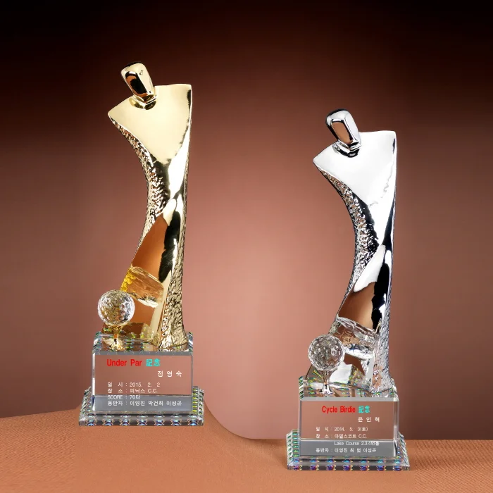 -스윙폼을 형상화 한 금속모션에 도금작업 후 화이트크리스탈 2단 받침에 접목시킨 골프 트로피입니다.