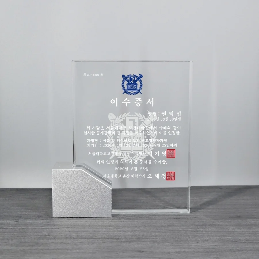 - 화이트크리스탈 상패이며, 받침은 알루미늄 아노다이징 처리되었습니다.